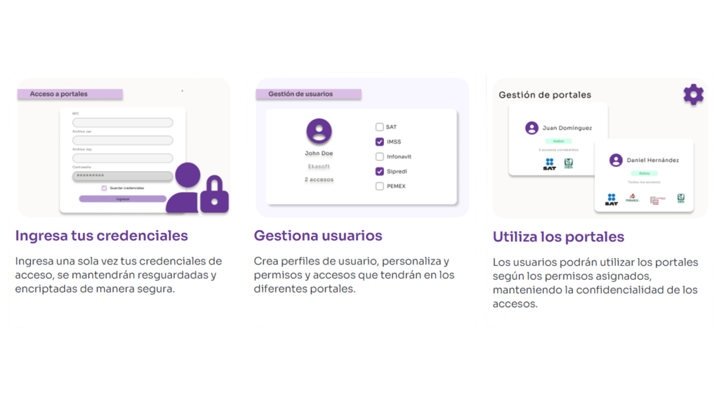 EasyLogin centraliza y controla el acceso a portales del SAT, IMSS e INFONAVIT sin exponer la FIEL, contraseñas ni datos sensibles. Define permisos granulares por portal, módulo o sección, automatiza tareas repetitivas (p. ej., descarga de Opinión de Cumplimiento y envío a grupos de correo) y reduce el riesgo operativo ante rotación de personal. Ingreso único de credenciales/FIEL y políticas claras de uso.